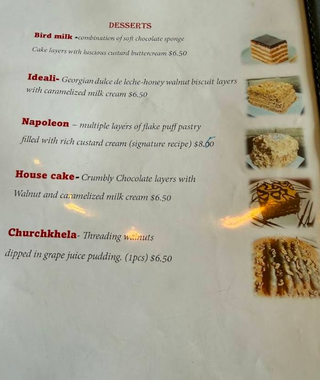 First time eating Georgian food; it was amazing! The restaurant is cute and quaint, and comfortable. Our waiter was super friendly, and helpful when it came to the menu. We ordered the Kubdari (meat pie), soup dumplings, and cheesy boat bread, along with the house cake and Bird’s milk cake for dessert. The portions were huge and reasonably priced. Everything was delicious and definitely tasted homemade. Super satisfying, and we left super full :) We are fans, we will be back!